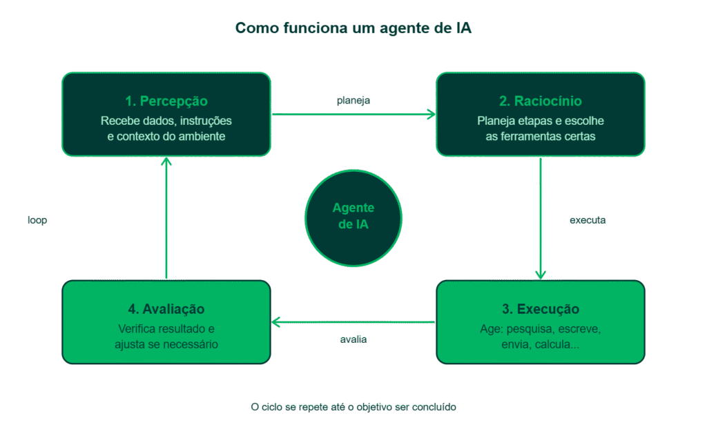 Para entender os agentes de IA, é útil pensar em um ciclo de quatro etapas que eles repetem continuamente até completar uma tarefa: